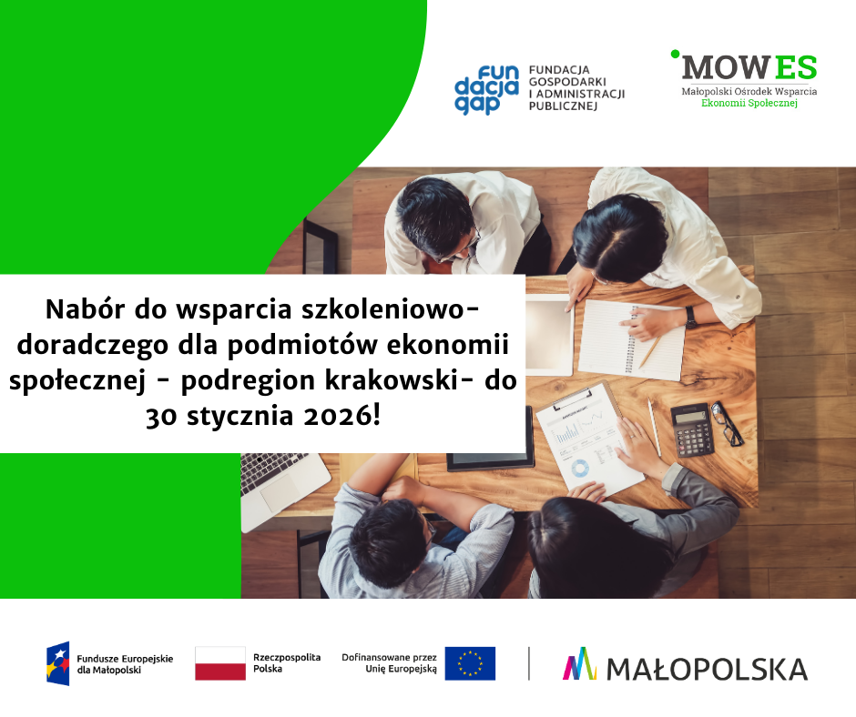 Prowadzisz podmiot ekonomii społecznej? Chcesz, żeby Twoja organizacja rozwijała się szybciej? Chcesz aby Twój podmiot był bardziej profesjonalny? Planujesz prowadzić działalność odpłatną, statutową, gospodarczą? Zgłoś się do Małopolskiego Ośrodka Wsparcia Ekonomii Społecznej. Oferujemy m.in. pomoc w prowadzeniu bieżącej działalności, doradztwo specjalistyczne m.in. biznesowe, prawne, księgowe, marketingowe, z zamówień publicznych i szkolenia!