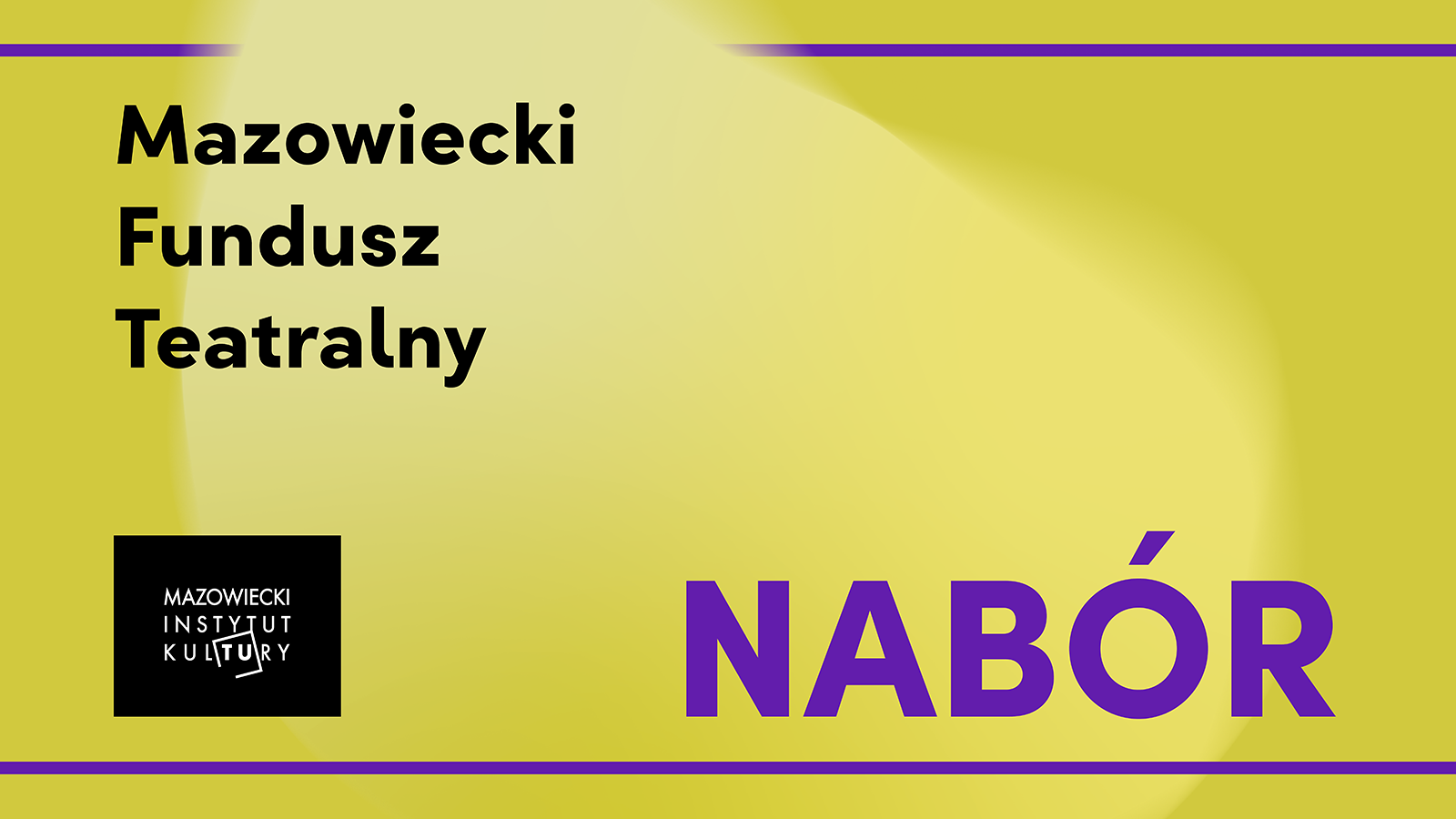 na grafice w górnym lewym rogu napis mazowiecki fundusz teatralny. poniżej logotyp Mazowieckiego insytutut kultury, który jest białymi literami na czarnym prostokacie. po prawej stronie filetowymi literami napisane NABÓR. całośc grafiki na jasno żółtym tle