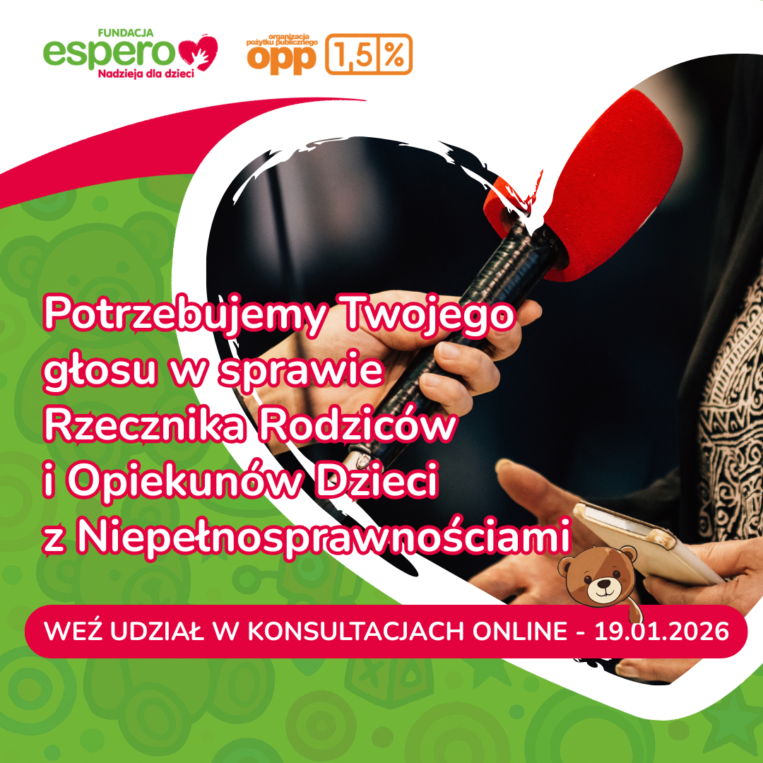 Czy polscy rodzice dzieci z niepełnosprawnościami muszą być „jednoosobowymi sztabami kryzysowymi”? Fundacja Espero mówi: dość samotnej walce z biurokracją. Już 19 stycznia odbędą się ogólnopolskie konsultacje społeczne projektu ustawy powołującej Rzecznika Rodzin OzN – organu, który ma zapewnić opiekunom osobistego koordynatora, bezpłatnego prawnika i realne wsparcie psychologiczne.