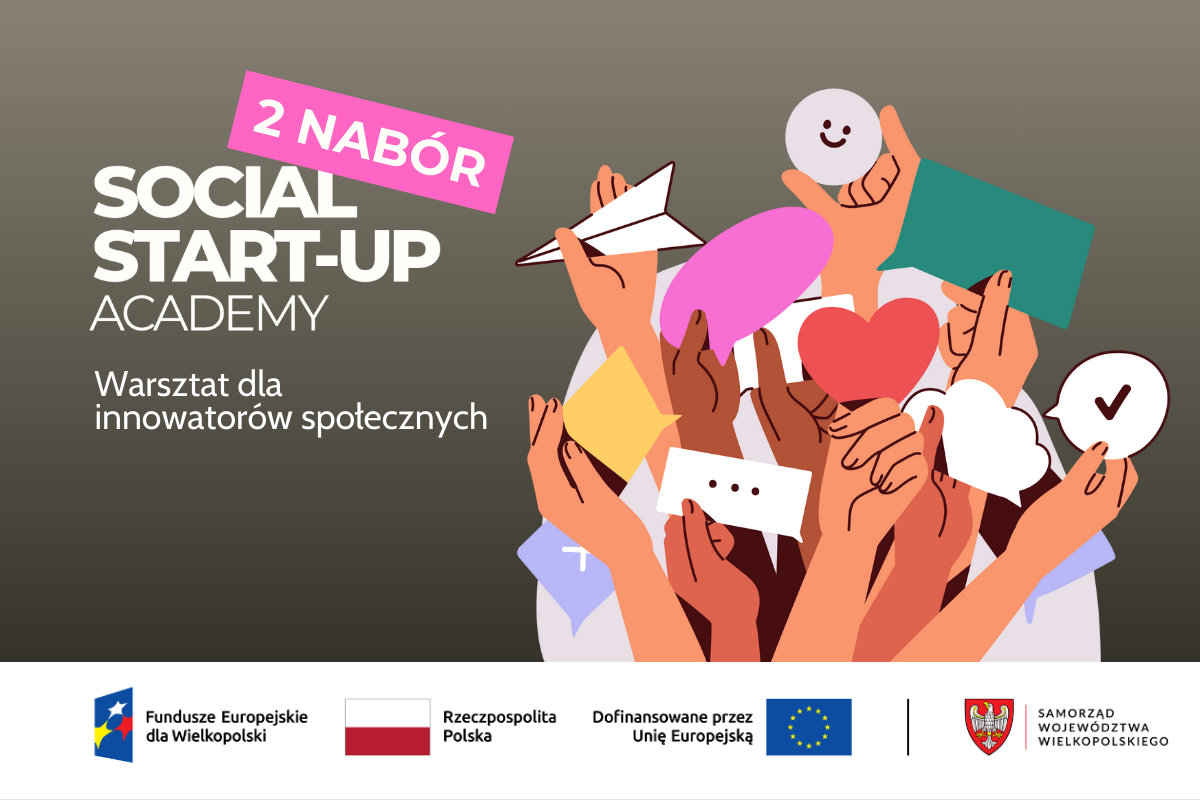 Grafika dłoni trzymających różne symbole dyskusji i komunikacji. Social Start-up Academy 2 nabór, Warsztat dla innowatorów społecznych, logotypy: Fundusze Europejskie dla Wielkopolski, Rzeczpospolita Polska, Dofinansowane przez UE, Samorząd Województwa Wielkopolskiego