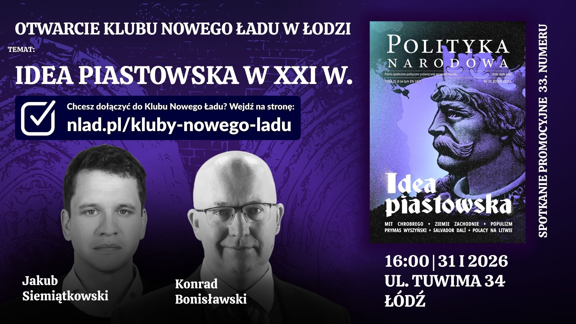 Inaugacyjne spotkanie łódzkiego Klubu Nowego Ładu poświęcone będzie współczesnej polskiej myśli narodowej oraz idei stojącej za działalnością portalu Nowy Ład. Prelegenci omówią współczesne znaczenie dziedzictwa piastowskiego, rolę silnego państwa narodowego oraz sens lokalnej, wspólnotowej aktywności patriotycznej. Wydarzenie ma charakter otwarty i zakończy się dyskusją z uczestnikami.