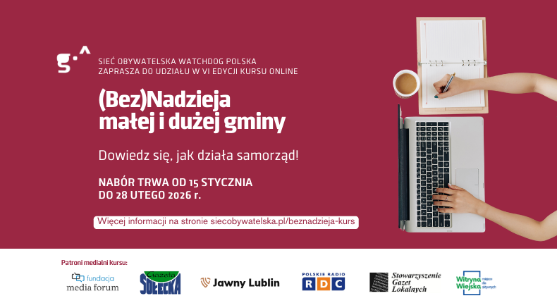 Sieć Obywatelska Watchdog Polska uruchomiła nabór do kolejnej edycji kursu „(Bez)Nadzieja małej i dużej gminy” – cyklu szkoleniowego dla osób, które chcą lepiej rozumieć, jak działa samorząd i jak skutecznie działać lokalnie: jako mieszkanki i mieszkańcy, radne i radni, sołtyski i sołtysi oraz osoby zaangażowane w sprawy swojej miejscowości.