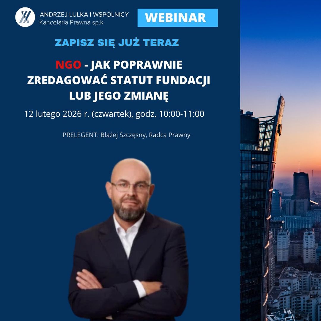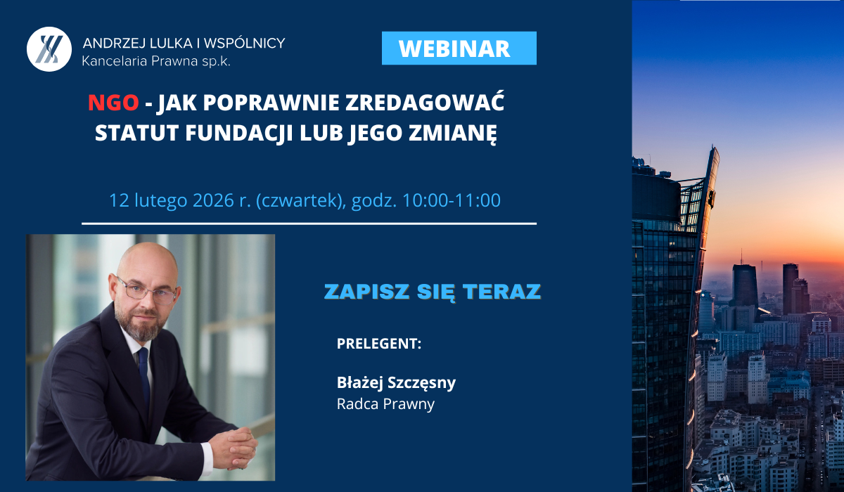 Andrzej Lulka i Wspólnicy Kancelaria Prawna sp.k. zaprasza na bezpłatny webinar pt. „Jak poprawnie zredagować statut fundacji lub jego zmianę”, który odbędzie się 12 lutego 2026 r. (czwartek) o godzinie 10:00.
