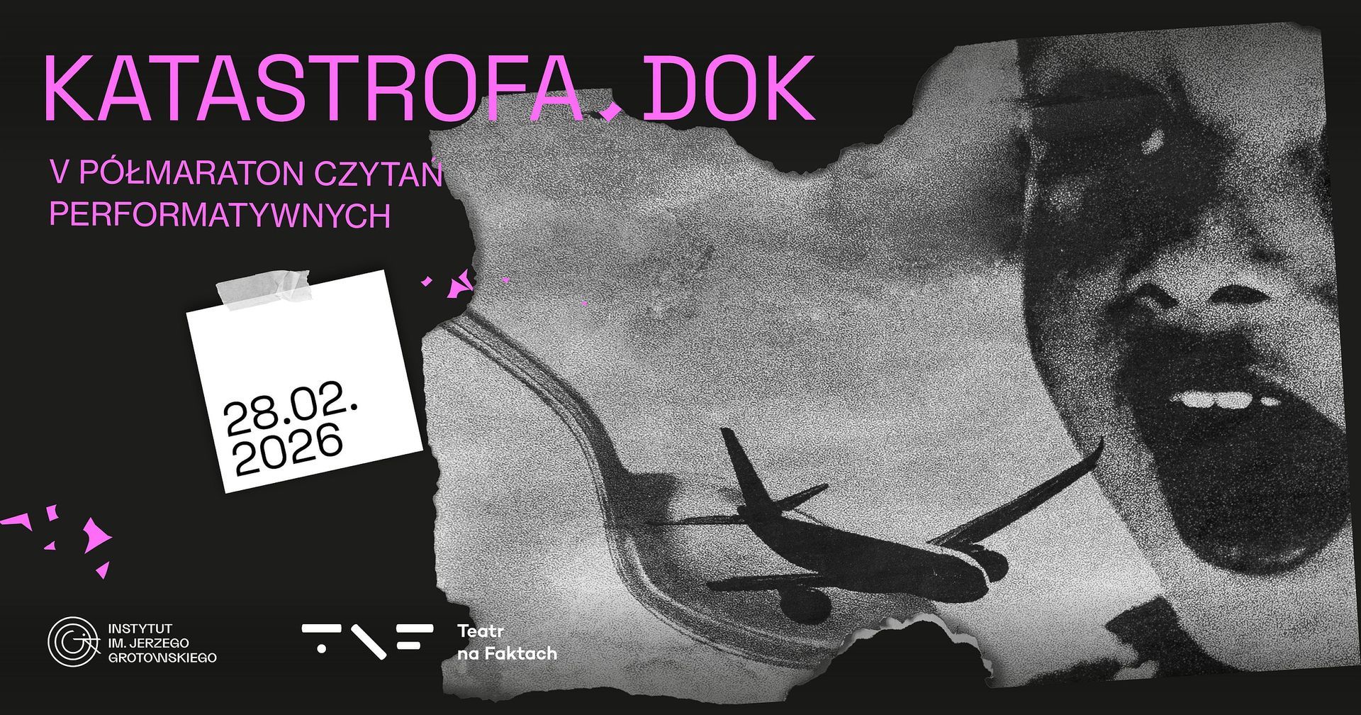 Instytut im. Jerzego Grotowskiego zaprasza na piątą edycję wydarzenia pod szyldem Teatru na Faktach – jednodniowy Półmaraton Czytań Performatywnych KATASTROFA.DOK. Motywem przewodnim tegorocznej edycji jest subiektywne przedstawienie katastrofy – zarówno w ujęciu globalnych procesów, jak i z prywatnej, intymnej perspektywy drobnych wydarzeń, które zmieniają postrzeganie dotychczasowej rzeczywistości.