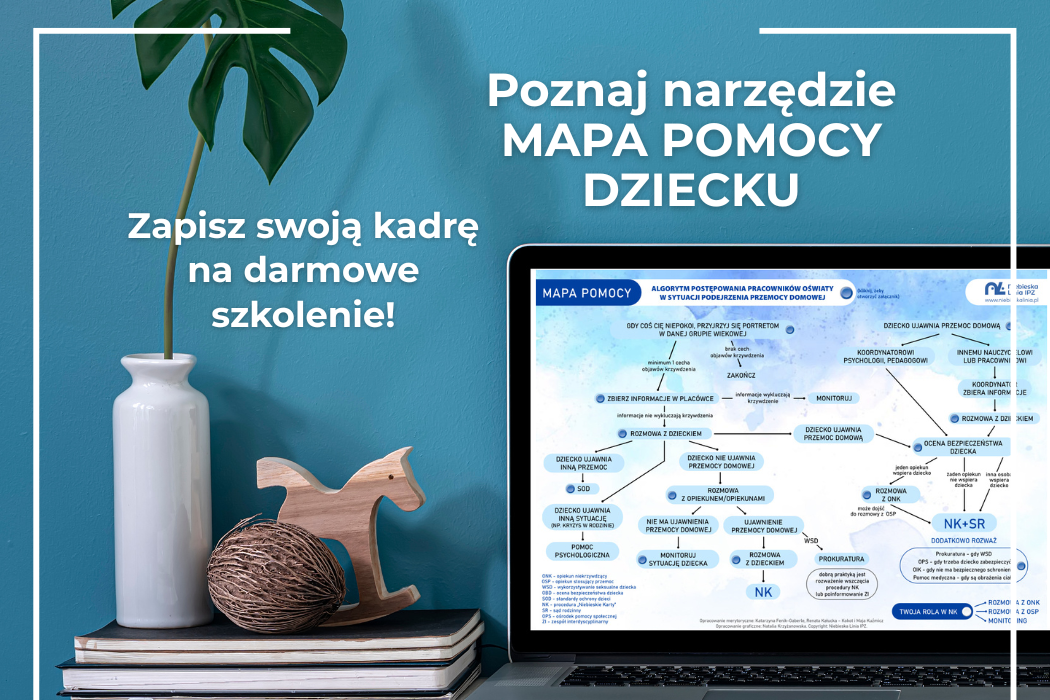 Zapraszamy do skorzystania ze szkolenia z praktycznego zastosowania narzędzia „MAPA POMOCY DZIECKU – algorytmy postępowania pracowników oświaty w sytuacji podejrzenia przemocy domowej”. 3 pierwsze placówki z Warszawy, które wyślą zgłoszenie na [email protected], będą mogły skorzystać z bezpłatnego przeszkolenia swojej kadry przez nasz zespół. W tytule prosimy wpisać „Mapa Pomocy”, a w treści dane kontaktowe do placówki.