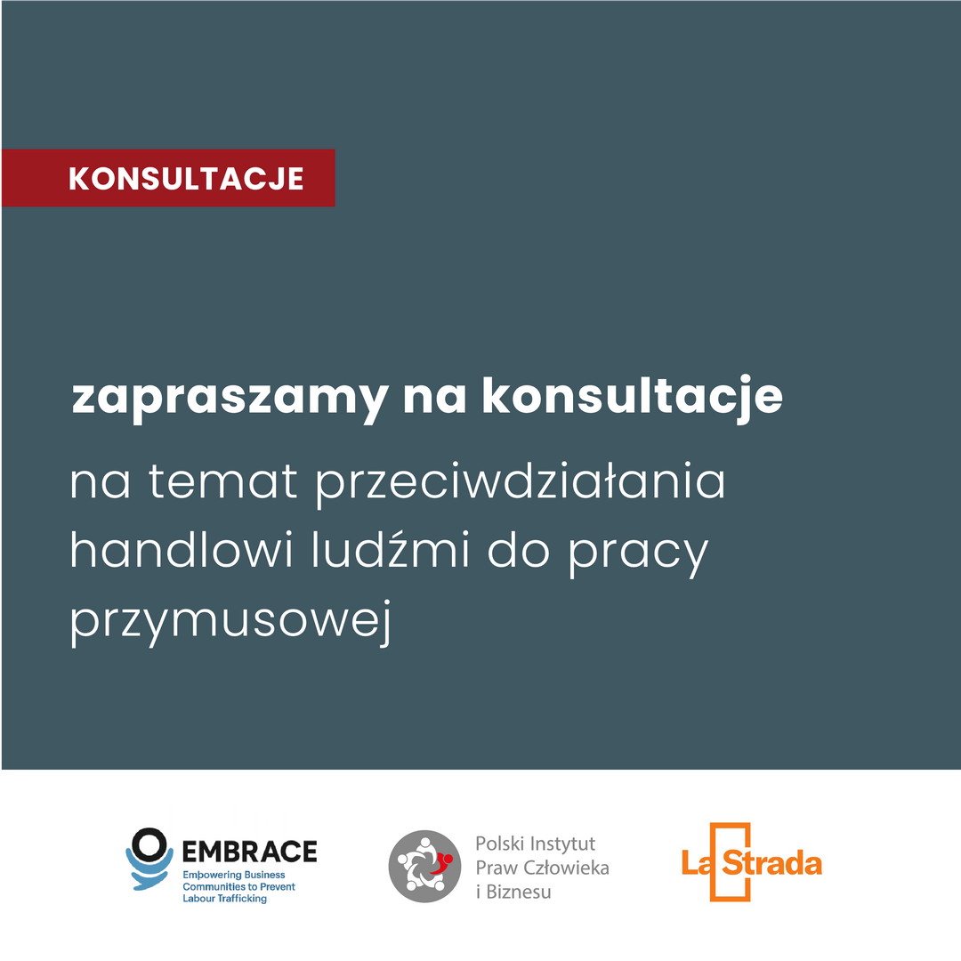 Polski Instytut Praw Człowieka i Biznesu i La Strada – FUNDACJA przeciwko HANDLOWI LUDŹMI I NIEWOLNICTWU zapraszają organizacje pozarządowe, środowisko akademickie oraz związki zawodowe do udziału w konsultacjach poświęconych zapobieganiu i przeciwdziałaniu handlowi ludźmi do pracy przymusowej na polskim rynku pracy.