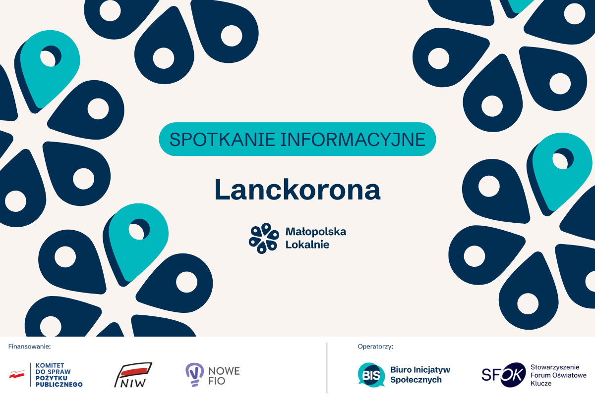 Grafika promująca spotkanie informacyjne programu „Małopolska Lokalnie” w Miechowie. Na jasnym tle z granatowo-turkusowym wzorem widnieje napis „Spotkanie informacyjne – Lanckorona” oraz logo programu. Na dole logotypy: Komitet do spraw Pożytku Publicznego, NIW-CRSO, NOWE FIO oraz operatorzy: Fundacja Biuro Inicjatyw Społecznych i Stowarzyszenie Forum Oświatowe Klucze.