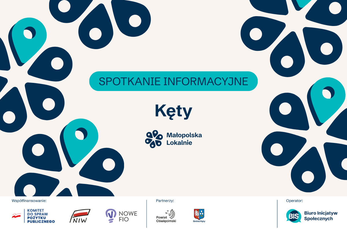 Grafika promująca spotkanie informacyjne programu „Małopolska Lokalnie” w Kętach. Na jasnym tle z granatowo-turkusowym wzorem widnieje napis „Spotkanie informacyjne – Kęty” oraz logo programu. Na dole logotypy: Komitet do spraw Pożytku Publicznego, Narodowy Instytut Wolności – CRSO, NOWE FIO, partnerzy: Powiat Oświęcimski i Gmina Kęty oraz operator: Fundacja Biuro Inicjatyw Społecznych.