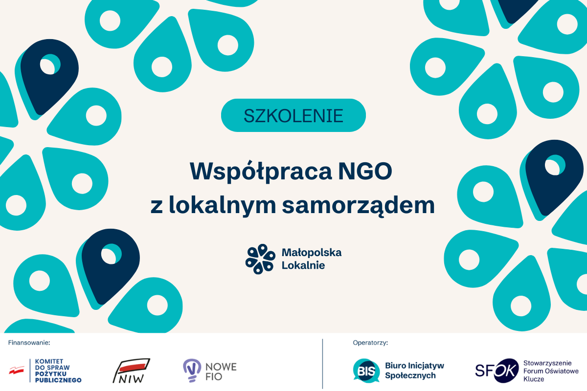 Grafika promująca szkolenie programu „Małopolska Lokalnie” pt. „Współpraca NGO z lokalnym samorządem”. Na jasnym tle z turkusowo-granatowym wzorem widnieje napis „Szkolenie – Współpraca NGO z lokalnym samorządem” oraz logo programu. Na dole logotypy: Komitet do spraw Pożytku Publicznego, Narodowy Instytut Wolności – CRSO, NOWE FIO oraz operatorzy: Fundacja Biuro Inicjatyw Społecznych i Stowarzyszenie Forum Oświatowe Klucze.