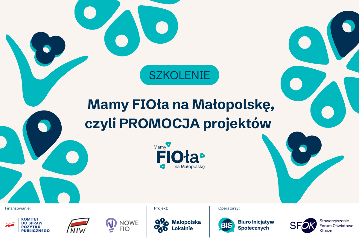 Grafika promująca szkolenie „Mamy FIOła na Małopolskę, czyli promocja projektów”. Na jasnym tle z turkusowo-granatowym wzorem widnieje tytuł szkolenia oraz logo konkursu „Mamy FIOła na Małopolskę”. Na dole logotypy: Komitet do spraw Pożytku Publicznego, Narodowy Instytut Wolności – CRSO, NOWE FIO, projekt Małopolska Lokalnie oraz operatorzy: Fundacja Biuro Inicjatyw Społecznych i Stowarzyszenie Forum Oświatowe Klucze.