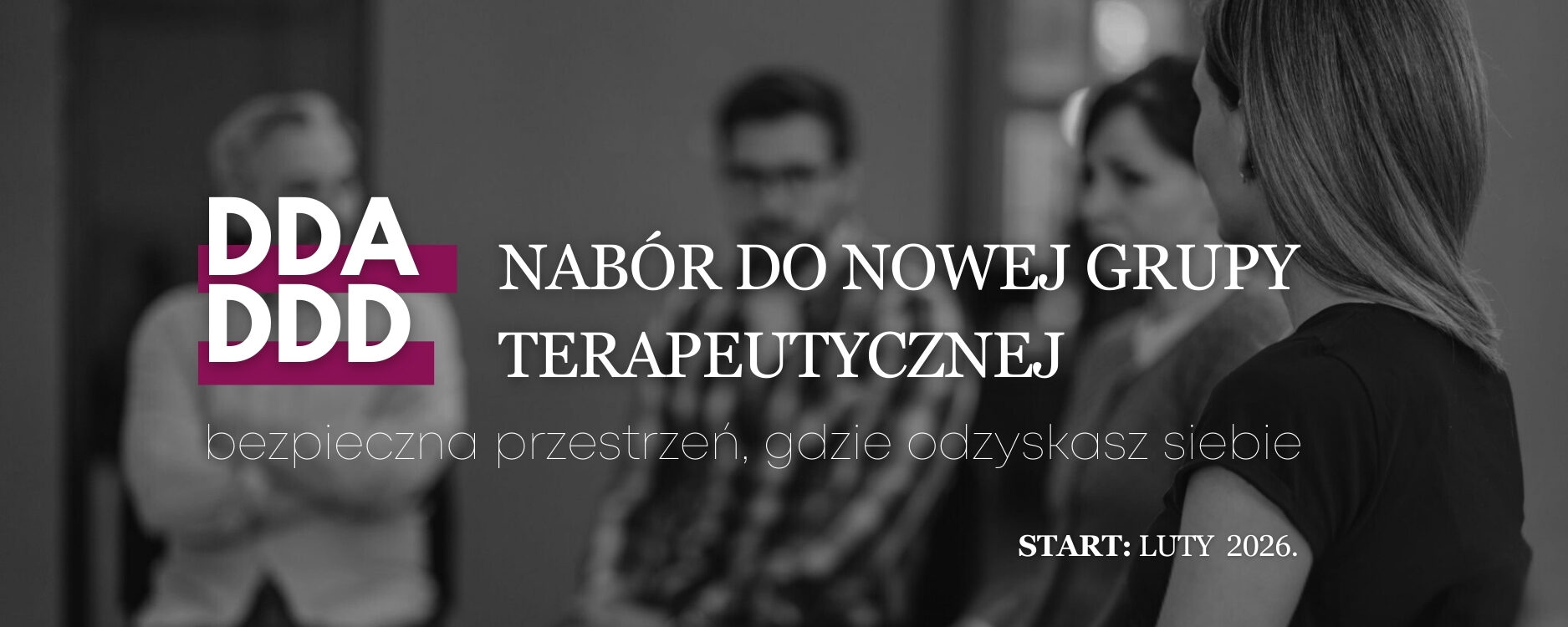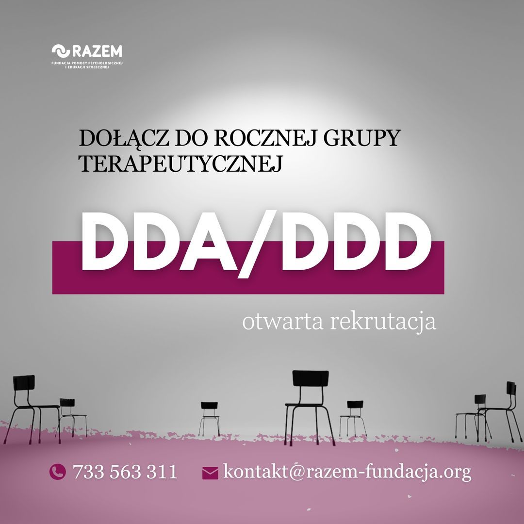 Nabór do grupy terapeutycznej DDA/ DDD (Dorosłe Dzieci Alkoholików/ Dorosłe Dzieci z Rodzin Dysfunkcyjnych)/. Zapraszamy do grupy, w której: lepiej zrozumiesz swoje wzorce relacyjne, emocje i potrzeby, nauczysz się stawiać granice i komunikować je w sposób spokojny i jasny, w życzliwej atmosferze będziesz ćwiczyć nowe sposoby bycia w relacji, doświadczysz, że bliskość może być bezpieczna, a kontakt z innymi — wspierający, a nie obciążający.