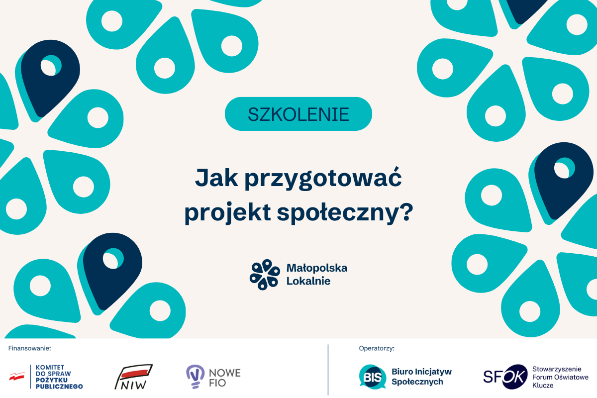 Grafika promująca szkolenie programu „Małopolska Lokalnie” pt. „Jak przygotować projekt społeczny?”. Na jasnym tle z turkusowo-granatowym wzorem widnieje napis „Szkolenie – Jak przygotować projekt społeczny?” oraz logo programu. Na dole logotypy: Komitet do spraw Pożytku Publicznego, Narodowy Instytut Wolności – CRSO, NOWE FIO oraz operatorzy: Fundacja Biuro Inicjatyw Społecznych i Stowarzyszenie Forum Oświatowe Klucze.