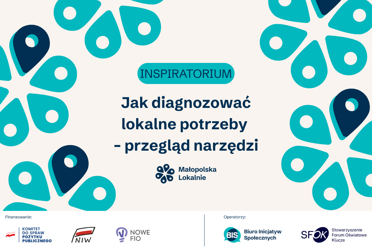 Grafika promująca inspiratorium programu „Małopolska Lokalnie” pt. „Jak diagnozować lokalne potrzeby – przegląd narzędzi”. Na jasnym tle z turkusowo-granatowym wzorem widnieje tytuł spotkania oraz logo programu. Na dole logotypy: Komitet do spraw Pożytku Publicznego, Narodowy Instytut Wolności – CRSO, NOWE FIO oraz operatorzy: Fundacja Biuro Inicjatyw Społecznych i Stowarzyszenie Forum Oświatowe Klucze.