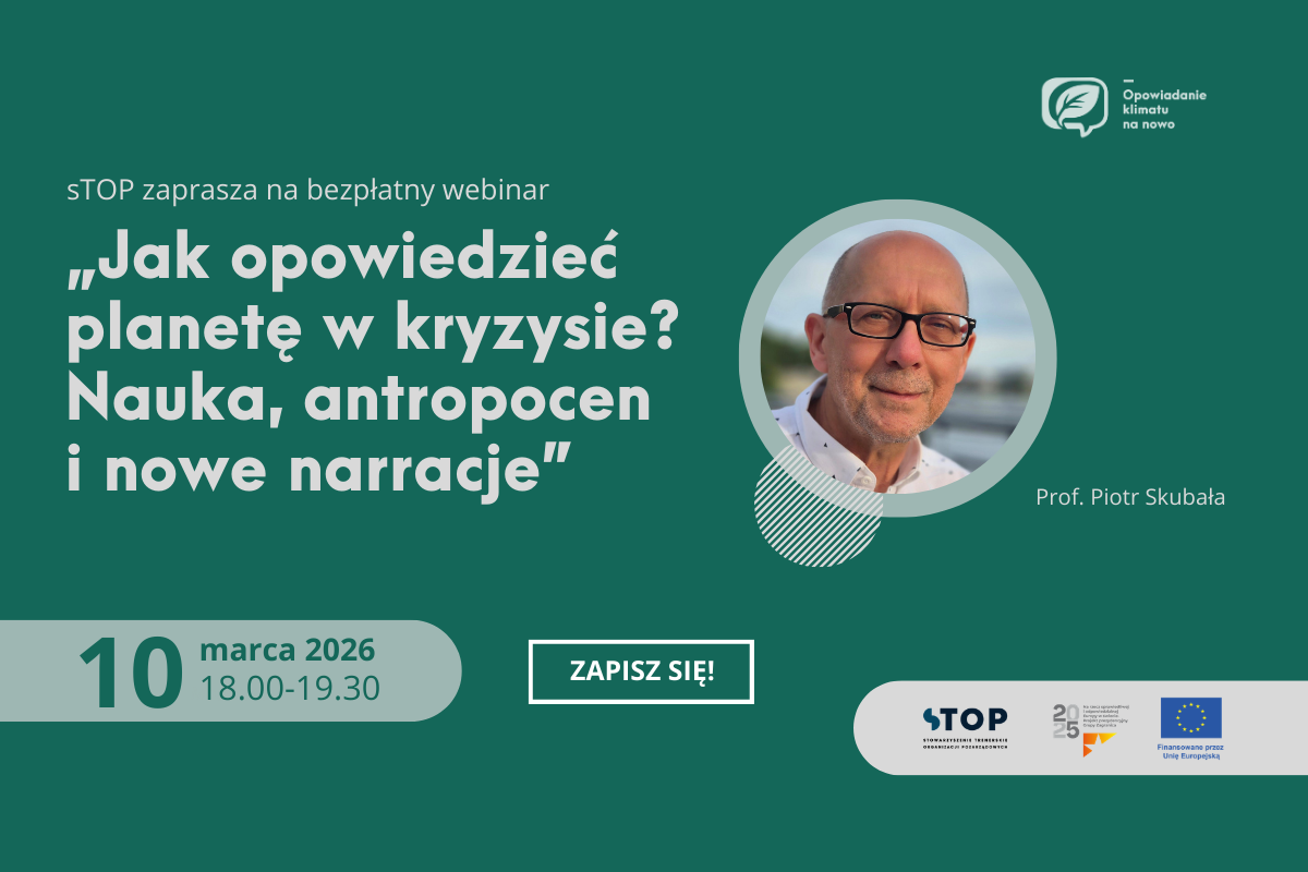 Stowarzyszenie Trenerskie Organizacji Pozarządowych zaprasza na bezpłatny webinar „Jak opowiedzieć planetę w kryzysie? Nauka, antropocen i nowe narracje”, który poprowadzi prof. Piotr Skubała. Termin: 10.03.2025, godz. 18.00