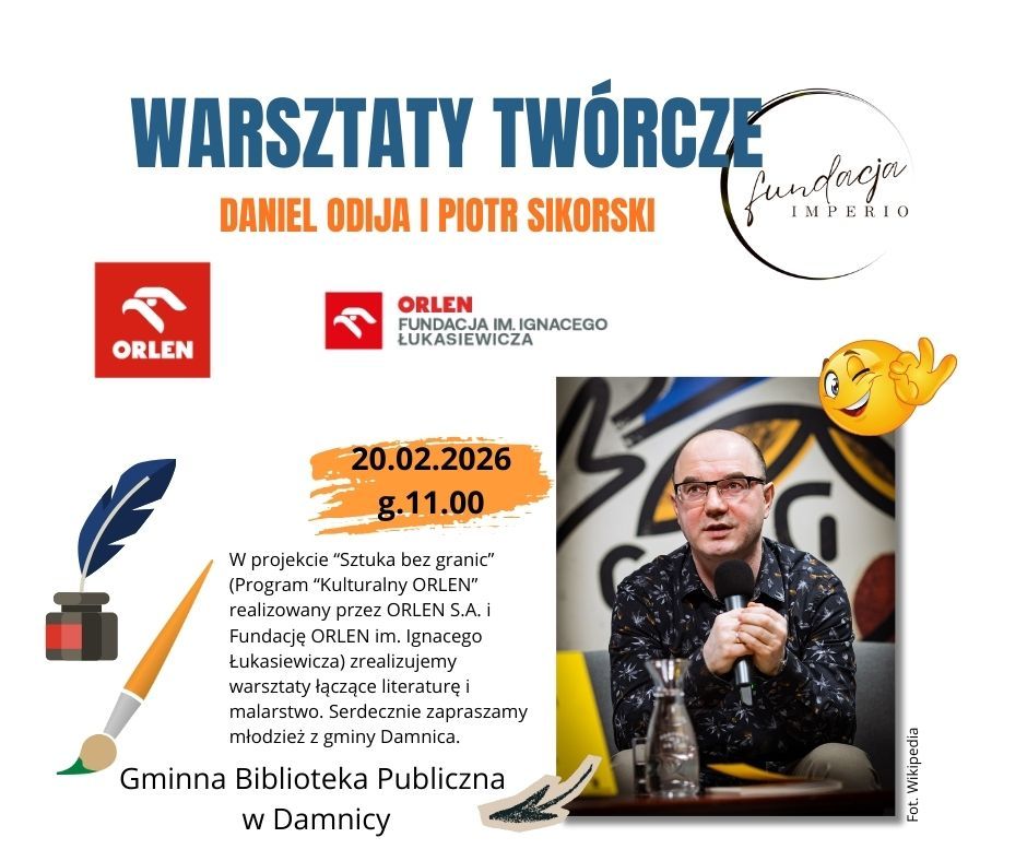 Tym razem spotykamy się 20 lutego o godzinie 10.45 w Gminnej Bibliotece Publicznej w Damnicy. Warsztaty poprowadzi duet: Daniel Odija (pisarz) i Piotr Sikorski (malarz). Więcej informacji na stronie Fundacji Imperio: www.fundacjaimperio.pl