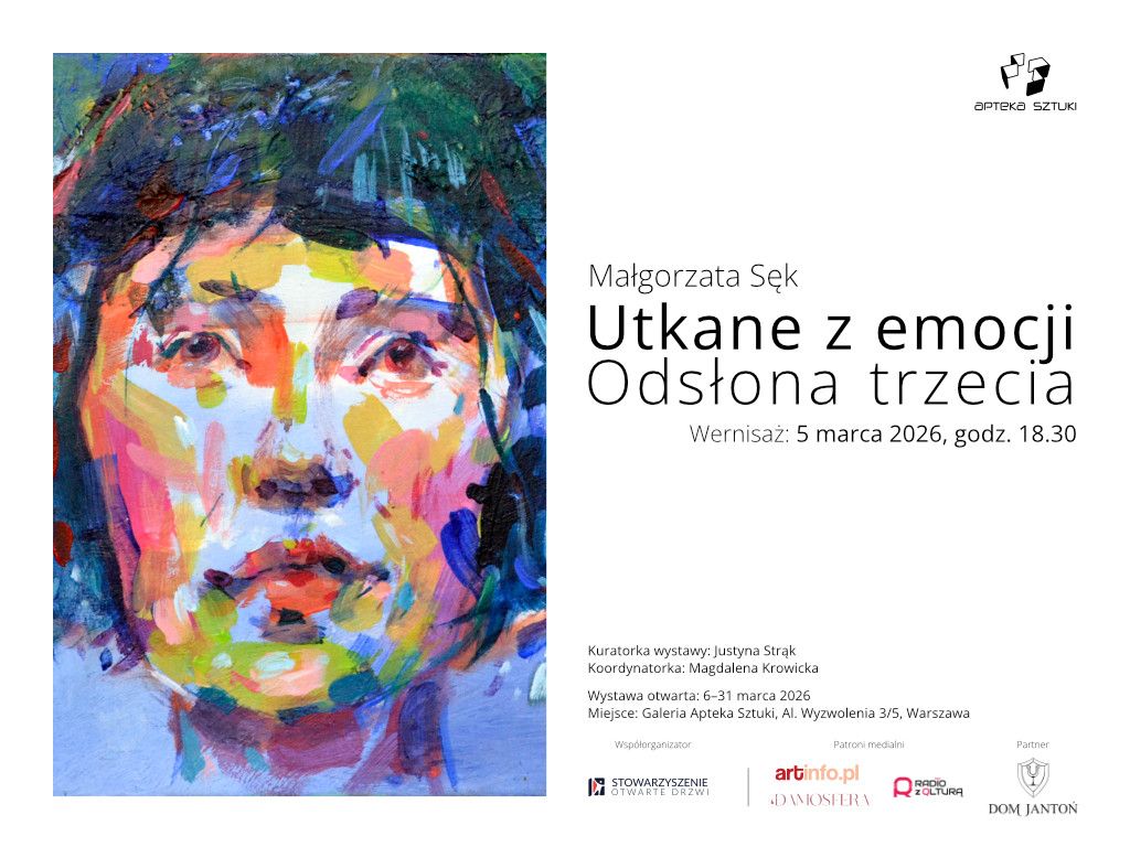 Autor/źródło: opracowanie graficzne: Apteka Sztuki, Piotr RaczkoZapraszamy na wernisaż wystawy Małgorzaty Sęk „Utkane z emocji. Odsłona trzecia”, który w pierwszym tygodniu marca będzie miał miejsce w galerii „Apteka Sztuki” przy Alei Wyzwolenia 3/5 w Warszawie.