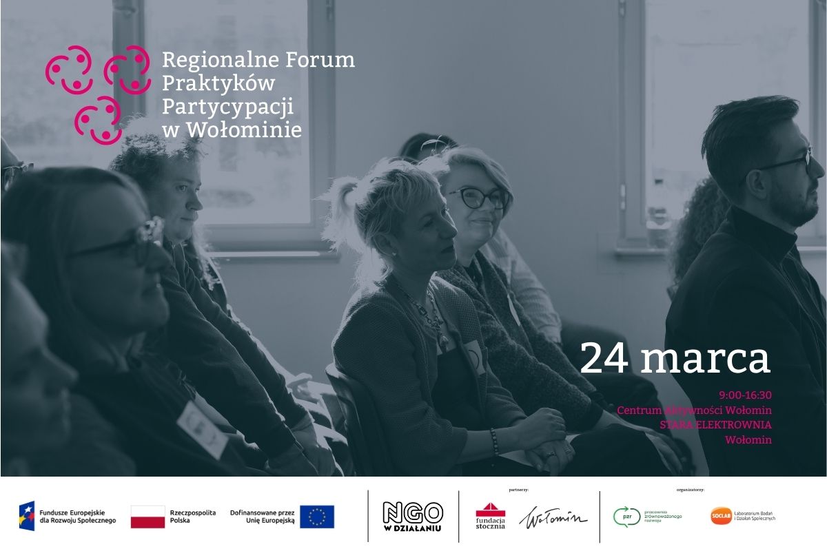 Baner wydarzenia „Regionalne Forum Praktyków Partycypacji w Wołominie”. Na zdjęciu w tle grupa kilku osób siedzi na sali i słucha prelekcji. Na grafice widnieje data 24 marca, godz. 9:00–16:30, miejsce: Centrum Aktywności Wołomin „Stara Elektrownia” w Wołominie. Na dole umieszczono logotypy partnerów i instytucji finansujących, w tym Funduszy Europejskich.