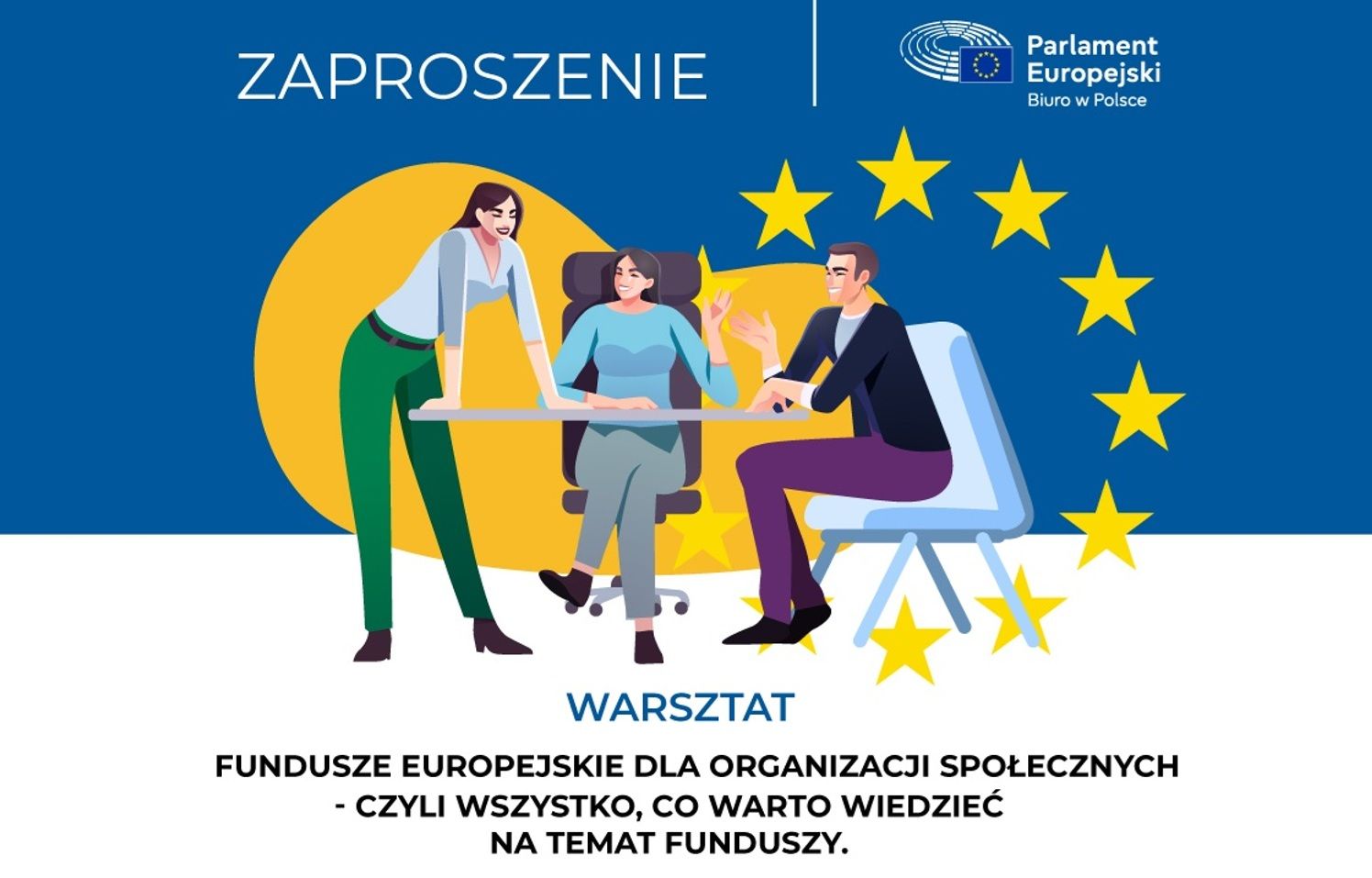 Biuro Parlamentu Europejskiego w Polsce zaprasza organizacje społeczne na warsztat "Fundusze Europejskie dla organizacji społecznych - czyli wszystko, co warto wiedzieć na temat funduszy", który odbędzie się 12 marca 2026, w godz. 10.00 - 13.00 w siedzibie Biura Parlamentu Europejskiego w Polsce, ul. Jasna 14/16 a, II., Warszawa. Uczestnicy szkolenia dowiedzą się m.in., jak pozyskiwać fundusze europejskie i jakie są inne formy finansowania.