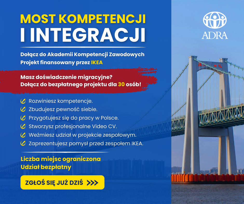 Fundacja ADRA Polska zaprasza osoby z doświadczeniem migracyjnym do udziału w bezpłatnym projekcie „Most Kompetencji i Integracji”, finansowanym przez IKEA. Program realizowany stacjonarnie w Katowicach obejmuje przygotowanie CV i profilu LinkedIn, symulacje rozmów kwalifikacyjnych, rozwój kompetencji cyfrowych oraz pracę nad projektem społecznym. Rekrutacja trwa. Liczba miejsc ograniczona.