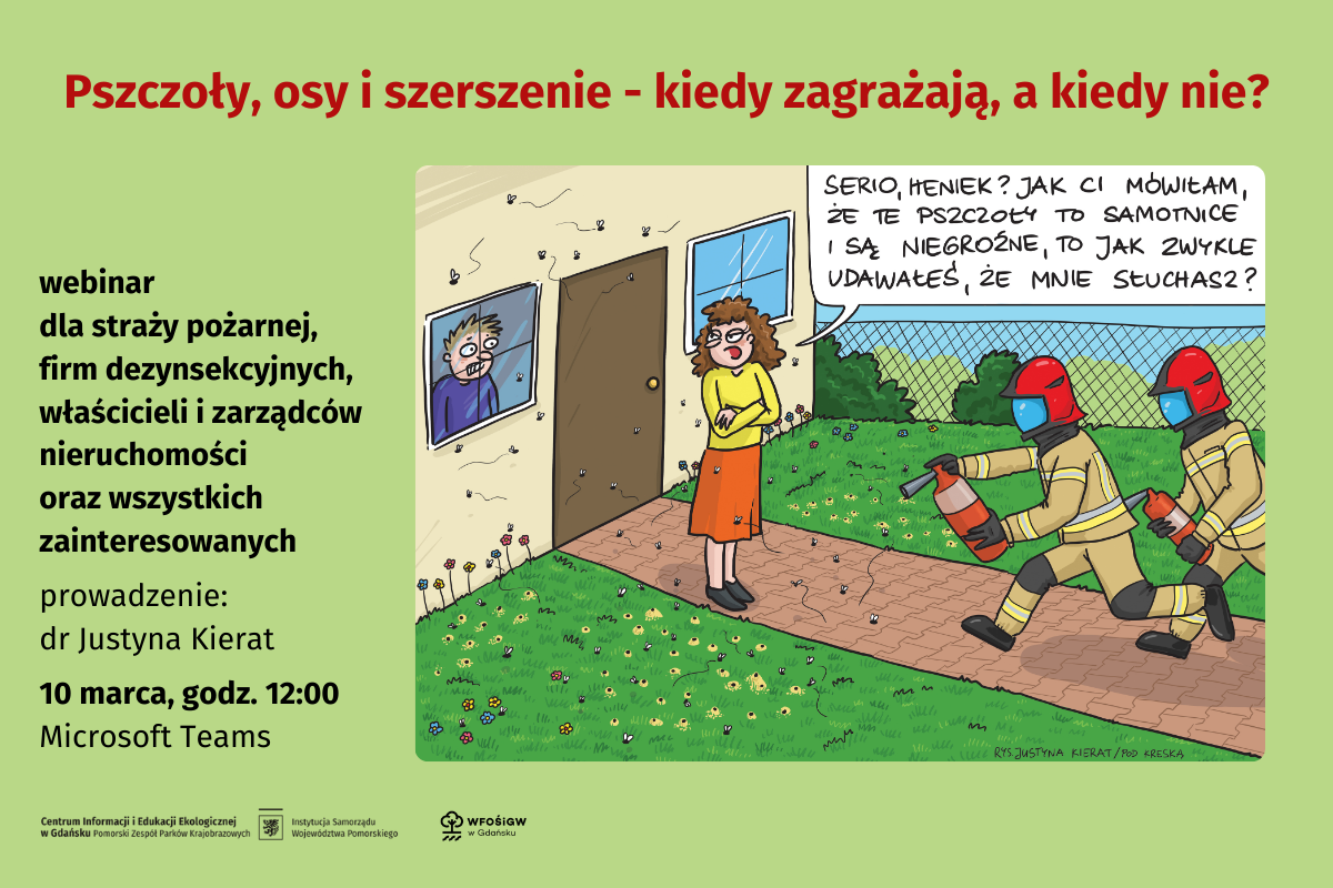 Autor/źródło: komiks autorstwa J. KieratGniazda owadów (pszczół, os, szerszeni) zlokalizowane w budynkach mieszkalnych lub ich sąsiedztwie mogą budzić obawy, jednak nie zawsze stanowią zagrożenie dla człowieka. Dlatego ich usuwanie nie zawsze jest konieczne, a nawet może wiązać się z zabijaniem gatunków chronionych. O ile rozpoznanie gatunku owada to zadanie dla specjalisty, to ocena, jakie ryzyko dla ludzi stwarza sąsiedztwo jego gniazda, jest dużo prostsza i do wykorzystania w pracy na co dzień. Na webinarze uczestnicy poznają proste sposoby wstępnego szacowania ryzyka ze strony gniazd pszczół, os czy szerszeni, co pomoże podjąć decyzję o tym, czy jego usunięcie jest konieczne.