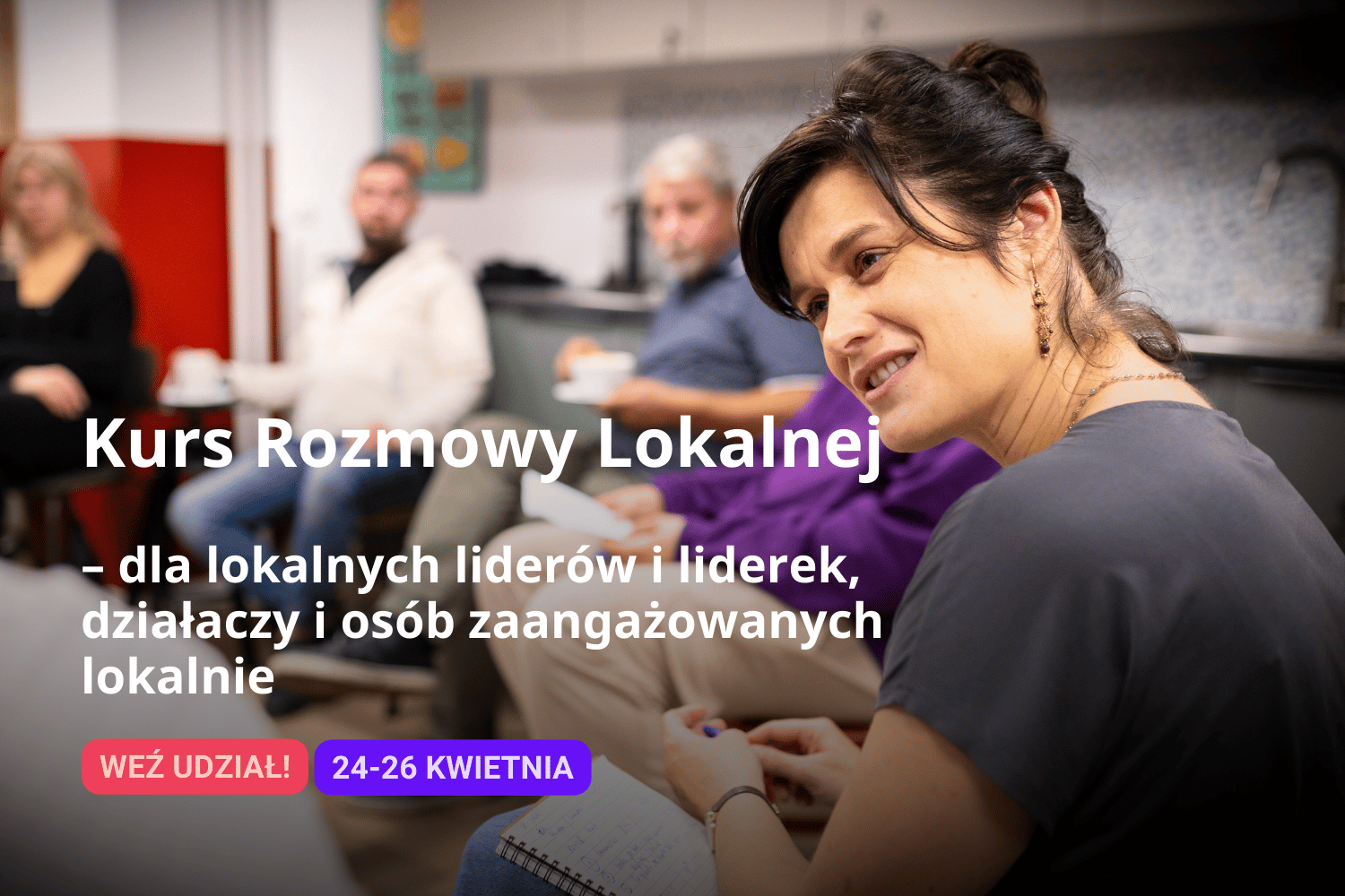 Zapraszamy na Kurs Rozmowy Lokalnej - bezpłatne szkolenie kierowane do zaangażowanych mieszkańców małych i średnich miejscowości. Podczas Kursu nauczysz się organizować i prowadzić rozmowy na trudne tematy w lokalnych społecznościach. Program obejmuje warsztaty online, 3-dniowy zjazd w Warszawie (24–26.04.2026) i sesję mentoringową. Na Kurs Rozmowy Lokalnej można zapisać się do 24 marca 2026 roku.