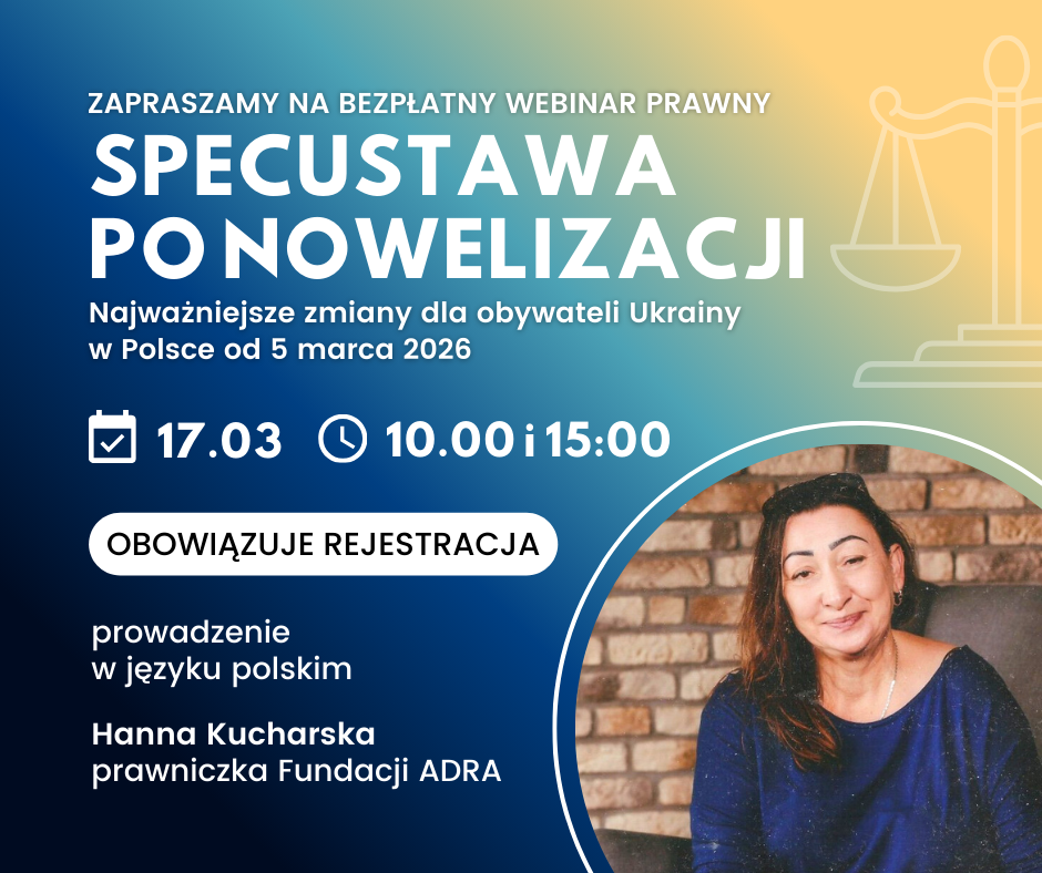 Fundacja ADRA zaprasza obywateli Ukrainy mieszkających w Polsce na bezpłatny webinar prawny dotyczący zmian w przepisach wynikających z nowelizacji Specustawy o pomocy obywatelom Ukrainy.
