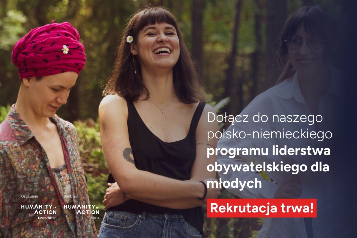 Na zdjęciu widoczne są trzy roześmiane młode kobiety. Po prawej stronie znajduje się napis: "Dołącz do naszego polsko-niemieckiego programu liderstwa obywatelskiego dla młodych. Rekrutacja trwa!". Po prawej stronie widnieją logotypy organizatorów: Humanity in Action Niemcy oraz Humanity in Action Polska