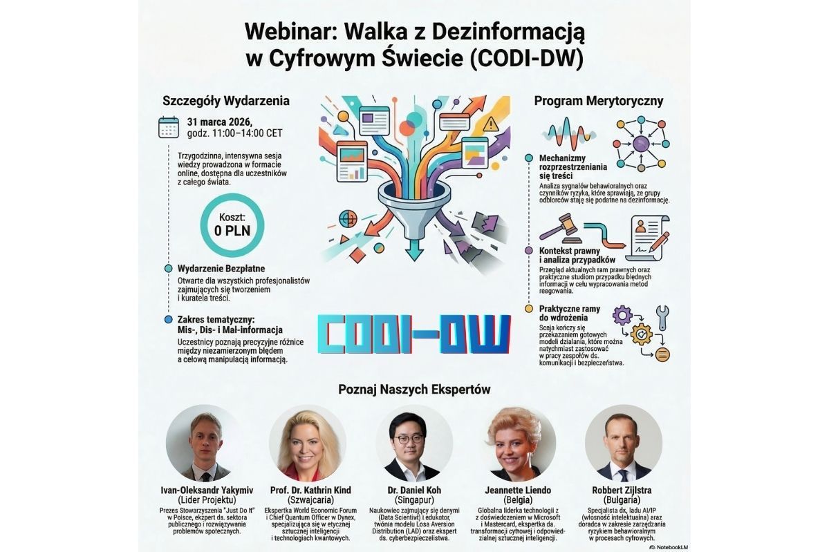 CODI (Instytut Badania Informacji i Dezinformacji) oraz globalna sieć CODI-DW zapraszają przedstawicieli organizacji pozarządowych, edukatorów i specjalistów ds. komunikacji na bezpłatny webinar "Combating Disinformation in the Digital World". Spotkanie odbędzie się 31 marca 2026 roku w formule online.