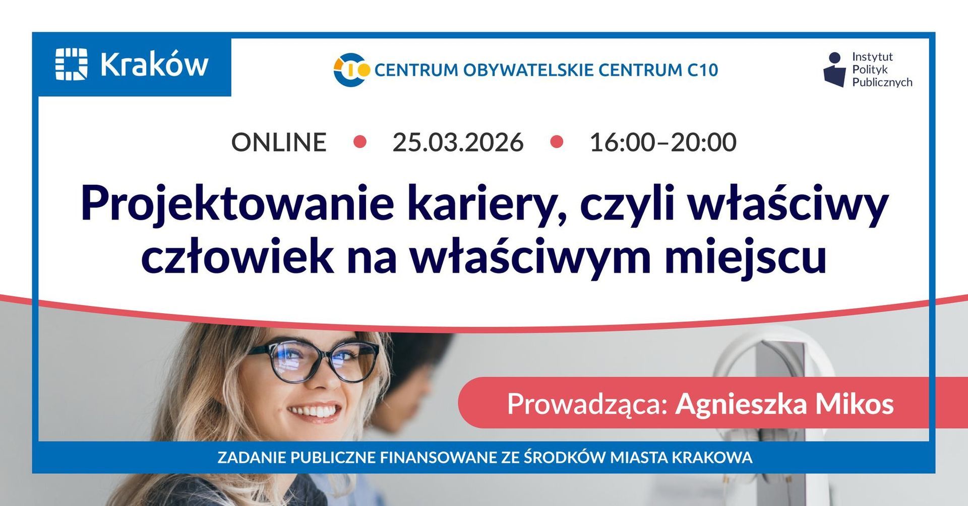 Fundacja Instytut Polityk Publicznych, operator Centrum Obywatelskiego Centrum C 10, zaprasza do udziału w bezpłatnym szkoleniu online pt. „Projektowanie kariery – właściwy człowiek na właściwym miejscu”. Wydarzenie odbędzie się w środę, 25 marca w godzinach 16:00-20:00.