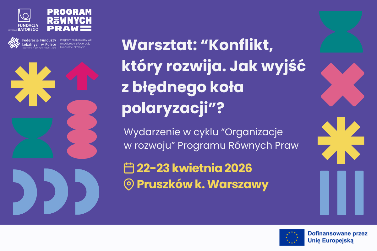 Warsztat: "Konflikt, który rozwija. Jak wyjść z błędnego koła polaryzacji?". Wydarzenie w cyklu "Organizacje w rozwoju" Programu Równych Praw. 22-23 kwietnia 2026, Pruszków k. Warszawy.