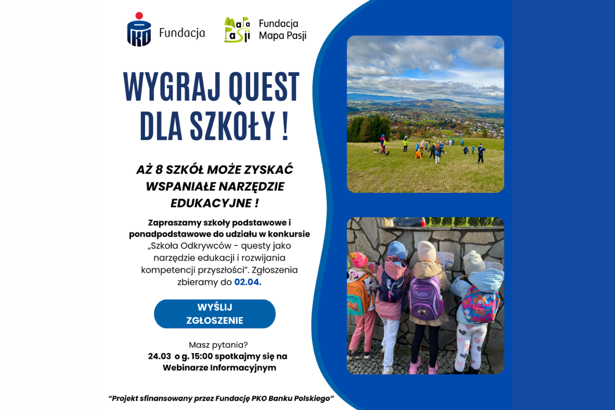 Osiem szkół otrzyma narzędzie edukacyjne w postaci questu - edukacyjnej gry terenowej, która zamieni zwykłą lekcję w prawdziwą przygodę. Zgłoszenia do konkursu "Szkoła Odkrywców - questy jako narzędzie edukacji i rozwijania kompetencji przyszłości" przyjmowane są do 2 kwietnia 2026 roku.