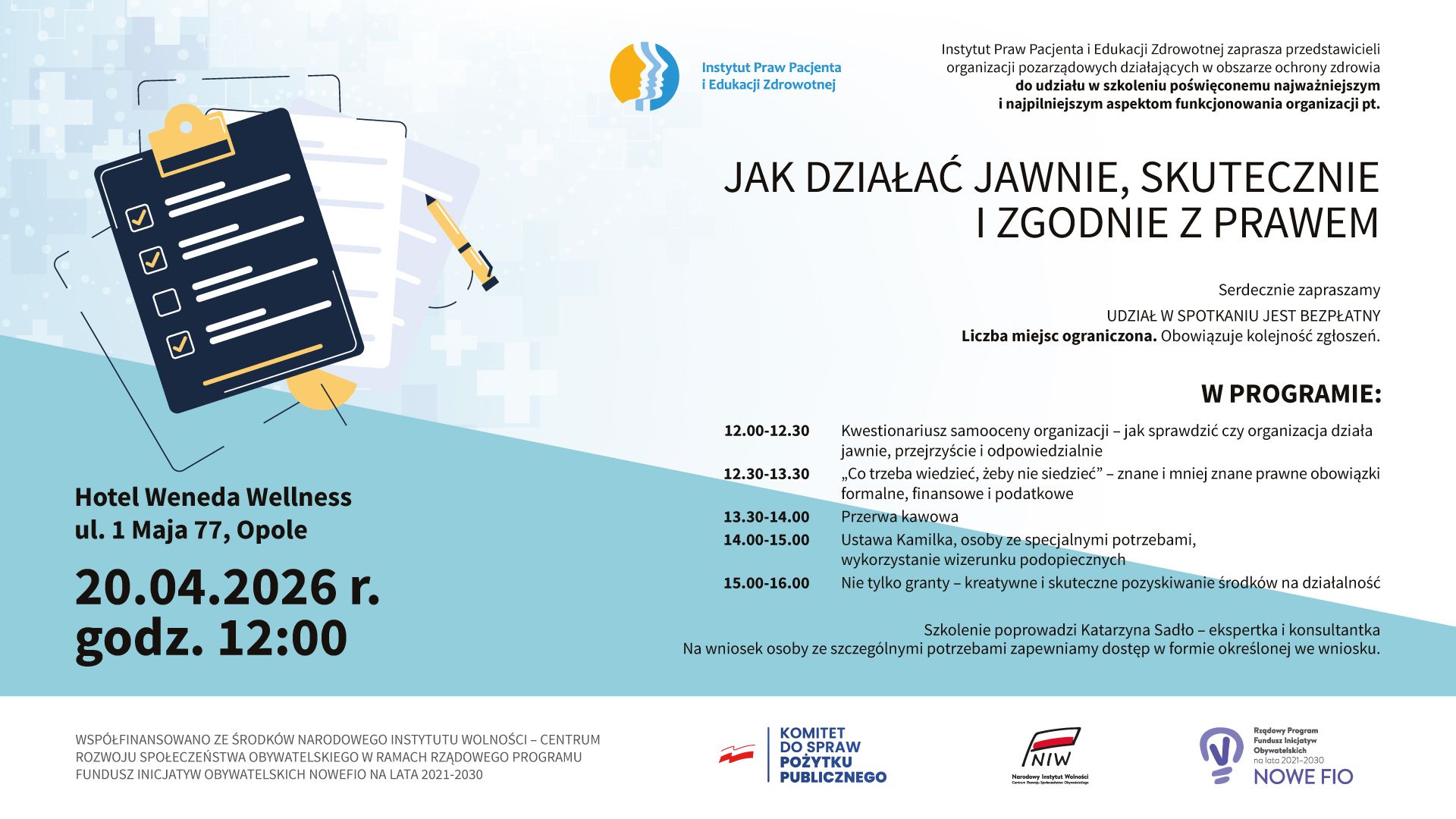 Zaproszenie na szkolenie pt. Jak działać jawnie, skutecznie i zgodnie z prawem" realizowane w Opolu dnia 20 kwietnia 2026 roku przez Instytut Praw Pacjenta i Edukacji Zdrowotnej.