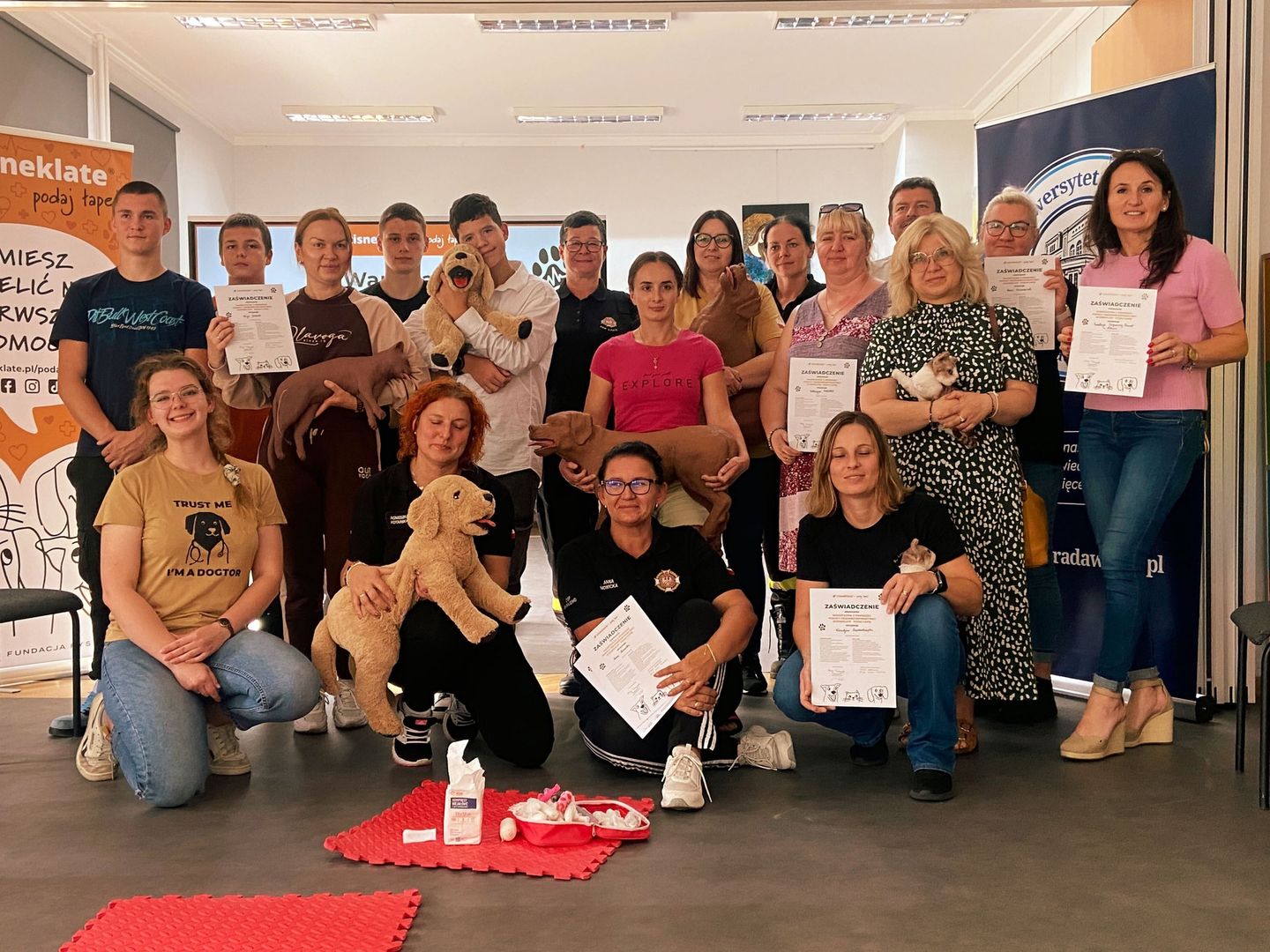 Podczas szkoleń wykorzystujemy fantomy piesków i kotków do ćwiczeń praktycznych z RKO i ćwiczeń praktycznych z opatrywania urazów, złamań i reagowaniu przy zadławieniu.