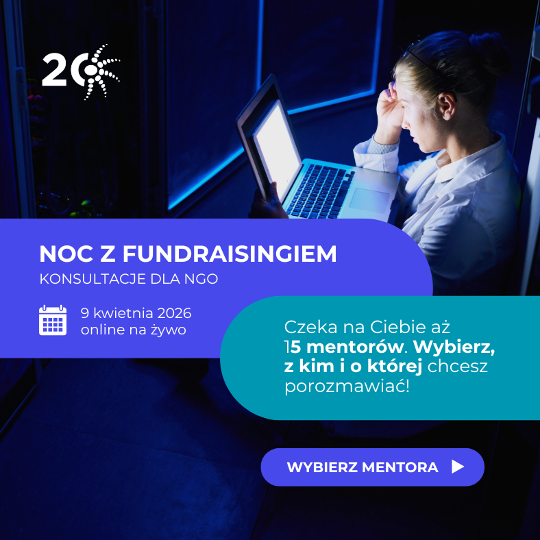 Twój kalendarz w ciągu dnia pęka w szwach, a Ty wciąż odkładasz ważne pytania dotyczące rozwoju swojej NGO? Mamy na to rozwiązanie! Zapraszamy na trzecią edycję Nocy z Fundraisingiem – wyjątkowe wydarzenie, podczas którego eksperci są dostępni wtedy, gdy Ty masz czas na spokojną rozmowę.