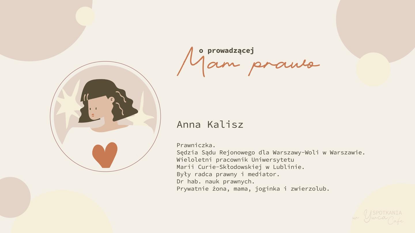 Zapraszamy na spotkanie przy kawie pod hasłem: "Mam prawo, czyli o wyrażaniu własnych opinii i nie tylko", które poprowadzi Anna Kalisz, prawniczka, sędzia, dr hab. nauk prawnych, a prywatnie żona, mama, joginka i zwierzolub.