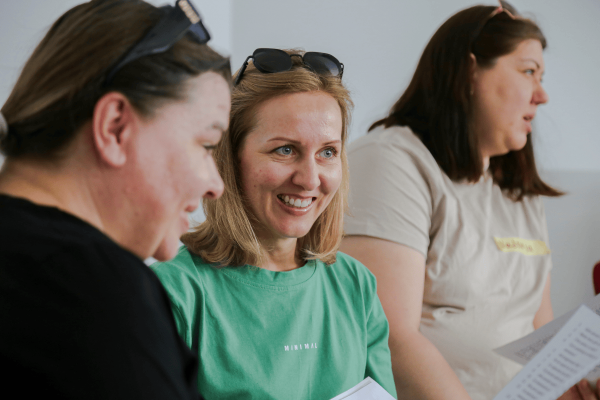 Trzy kobiety siedzą obok siebie, wszystkie mają na czole okulary przeciwsłoneczne. Kobieta po lewej ma czarną koszulkę i ciemne włosy, jest ustawiona prawym profilem. Kobieta pośrodku ma blond włosy i jasną koszulkę, szeroko się uśmiecha. Kobieta jest ustawiona prawym profilem, ma beżową koszulkę i ciemne włosy. Wszystkie osoby trzymają kartki z tekstem.