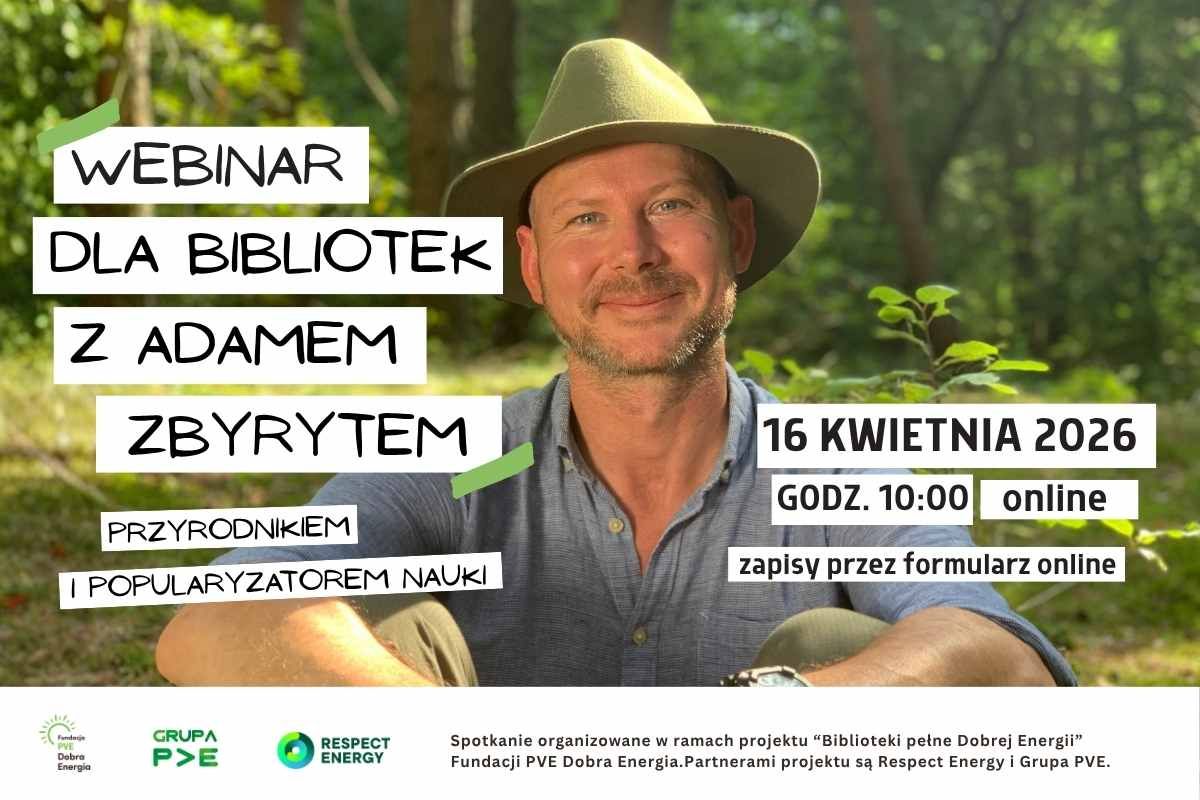 W najbliższy czwartek 16.04.2026 o godz. 10:00 zapraszamy wszystkie biblioteki na bezpłatny webinar z przyrodnikiem i popularyzatorem nauki Adamem Zbyrytem - Człowiekiem z puszczy. Spotkanie odbywa się w ramach projektu "Biblioteki pełne Dobrej Energii".