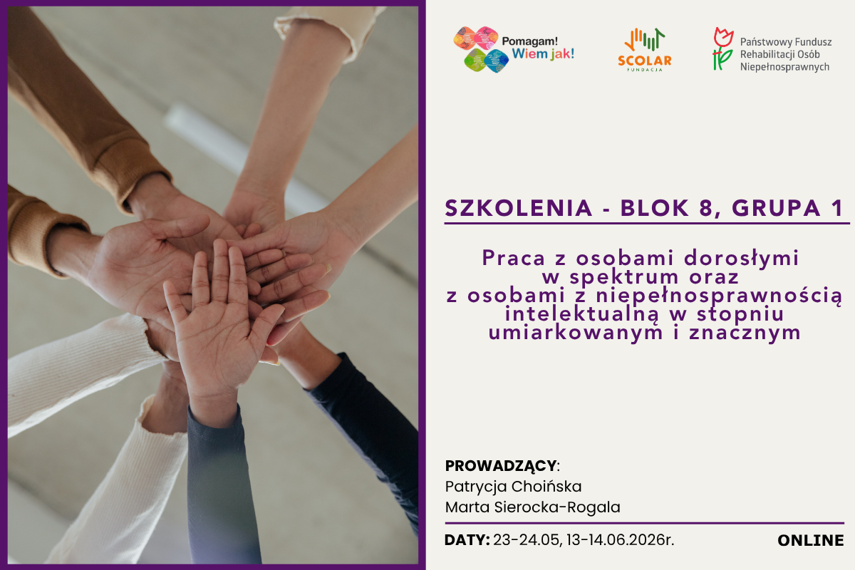 Otwieramy zapisy w BLOKU 8 pt. "Praca z osobami dorosłymi w spektrum oraz z osobami z niepełnosprawnością intelektualną w stopniu umiarkowanym i znacznym" na GRUPĘ 1 (ON-LINE)!