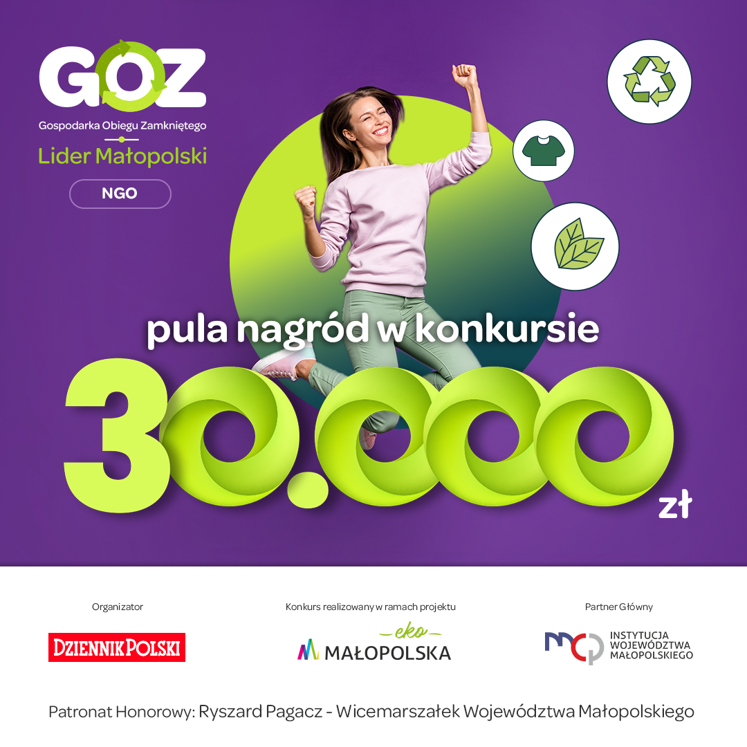 Wystartowała V edycja konkursu GOZ Lider Małopolski, skierowanego do przedsiębiorców, organizacji pozarządowych oraz szkół ponadpodstawowych, które wdrażają zasady gospodarki obiegu zamkniętego. Celem konkursu jest promocja podmiotów z Małopolski, które skutecznie łączą swoje działania z troską o środowisko. Na uczestników czekają nagrody finansowe o łącznej wysokości 30 000 zł.