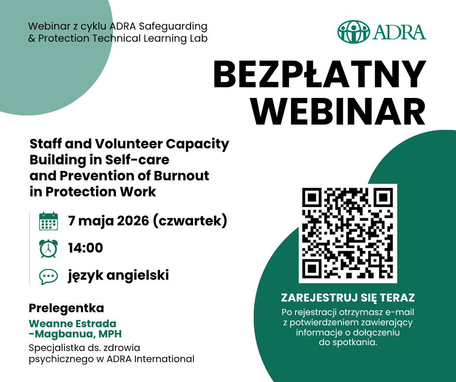 Fundacja ADRA zaprasza na bezpłatny webinar dotyczący dbania o zdrowie psychiczne i zapobiegania wypaleniu zawodowemu w pracy pomocowej. Spotkanie skierowane jest do pracowników NGO, wolontariuszy i osób wspierających innych. Uczestnicy poznają praktyczne sposoby radzenia sobie z obciążeniem i budowania odporności psychicznej. Webinar odbędzie się 7 maja 2026 r. w języku angielskim.