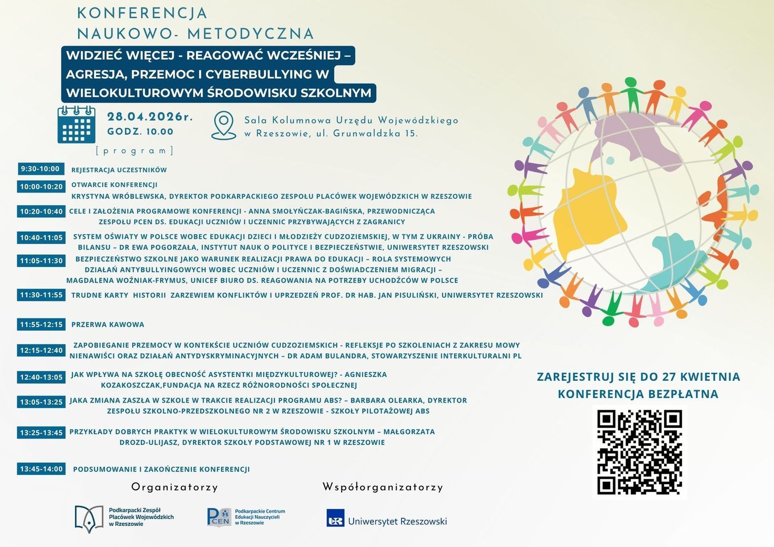 ,,WIDZIEĆ WIĘCEJ – REAGOWAĆ WCZEŚNIEJ – AGRESJA, PRZEMOC I CYBERBULLYING w WIELOKULTUROWYM ŚRODOWISKU SZKOLNYM”. Jest to wojewódzka konferencja naukowo-metodyczna organizowana przez Podkarpackie Centrum Edukacji Nauczycieli we współpracy z Instytutem Nauk o Polityce i Bezpieczeństwie Uniwersytetu Rzeszowskiego w dniu 28 kwietnia 2026 roku w Sali Kolumnowej Urzędu Wojewódzkiego w Rzeszowie, ul. Grunwaldzka 15, w godz. 10.00-14.00.