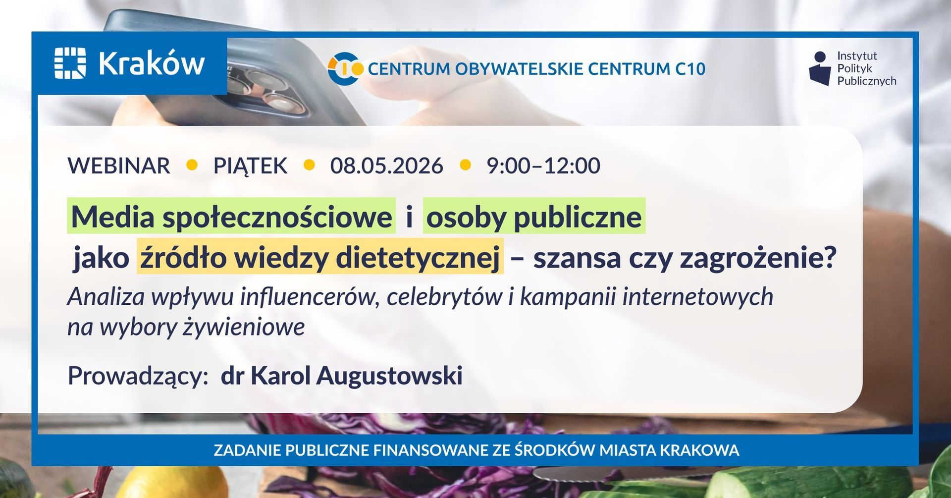 Fundacja Instytut Polityk Publicznych oraz Centrum Obywatelskie Centrum C 10 zapraszają do udziału w szkoleniu online poświęconym roli mediów społecznościowych oraz osób publicznych jako źródeł wiedzy dietetycznej. Webinar odbędzie się w piątek, 8 maja, o godz. 9:00. Udział jest bezpłatny!